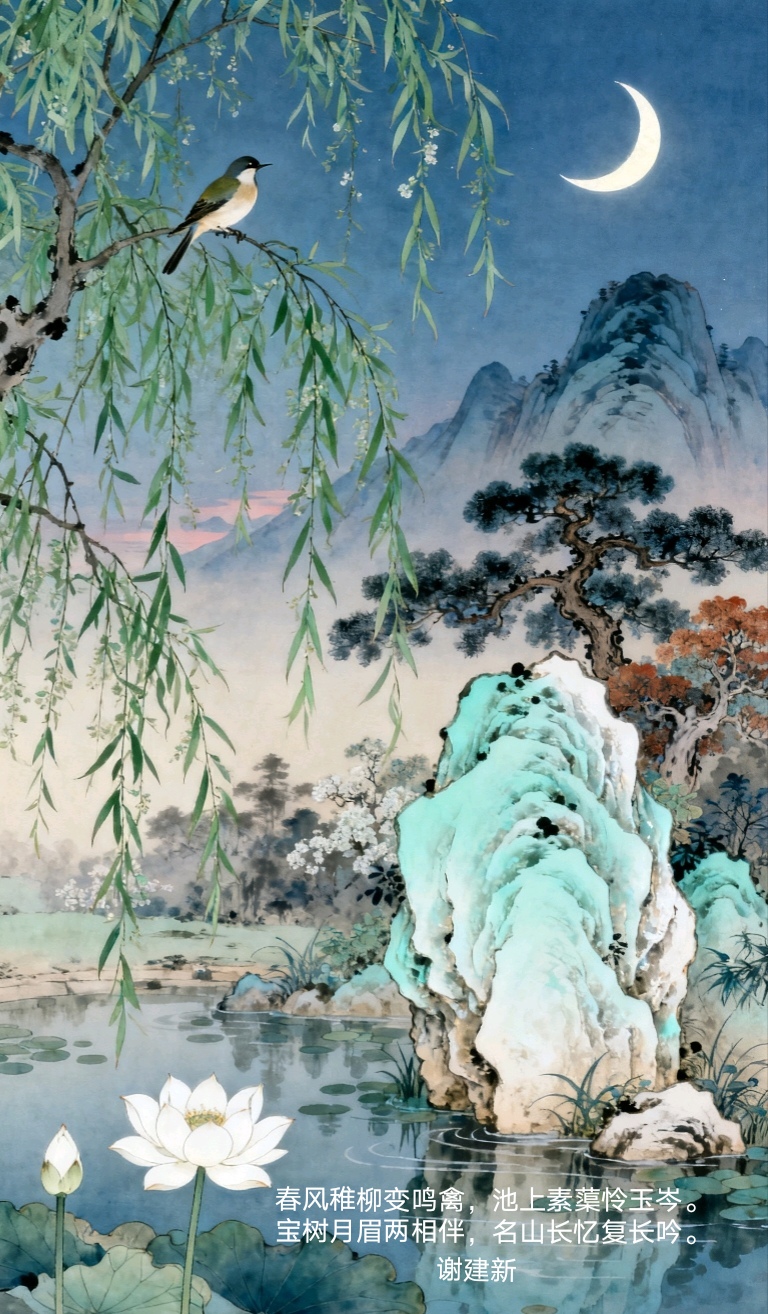 最后,在语言风格上,谢建新的这首诗既保留了古典诗歌的韵味和格律,又融入了现代语言的简洁和明快,形成了自己独特的语言风格。这种传统与现代的融合,体现了谢建新在艺术创作上的探索和创新。